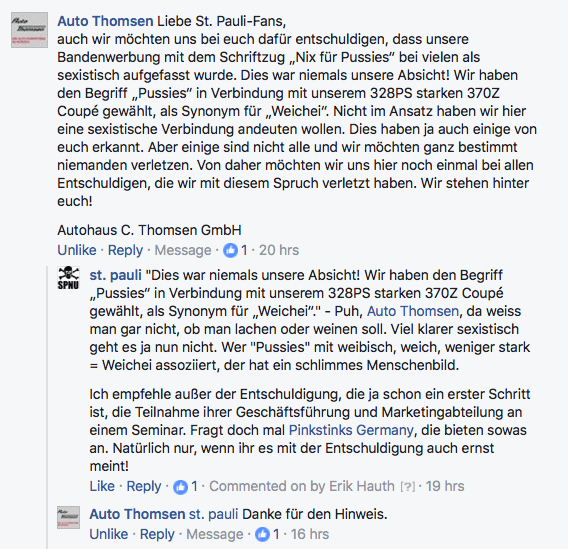 Ich bin nicht überrascht. Das ist ein beinahe typisches Verhalten von „ertappten“ Sexisten: „Tschulligung“ – und gut. Ich vermute, so unreif, wie die Entschuldigung, ist auch das Interesse, sich tatsächlich mit dem Thema auseinander zu setzen. Bei Auto-Thomsen genauso, wie beim Vermarkter des FC St. Pauli.