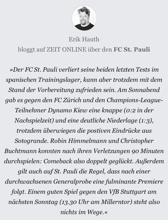 »Der FC St. Pauli verliert seine beiden letzten Tests im spanischen Trainingslager, kann aber trotzdem mit dem Stand der Vorbereitung zufrieden sein. Am Sonnabend gab es gegen den FC Zürich und den Champions-League-Teilnehmer Dynamo Kiew eine knappe (0:2 in der Nachspielzeit) und eine deutliche Niederlage (1:3), trotzdem überwiegen die postiven Eindrücke aus Sotogrande. Robin Himmelmann und Christopher Buchtmann konnten nach ihren Verletzungen 90 Minuten durchspielen: Comeback also doppelt geglückt. Außerdem gilt auch auf St. Pauli die Regel, dass nach einer durchwachsenen Generalprobe eine fulminante Premiere folgt. Einem guten Spiel gegen den VfB Stuttgart am nächsten Sonntag (13.30 Uhr am Millerntor) steht also nichts im Wege.«