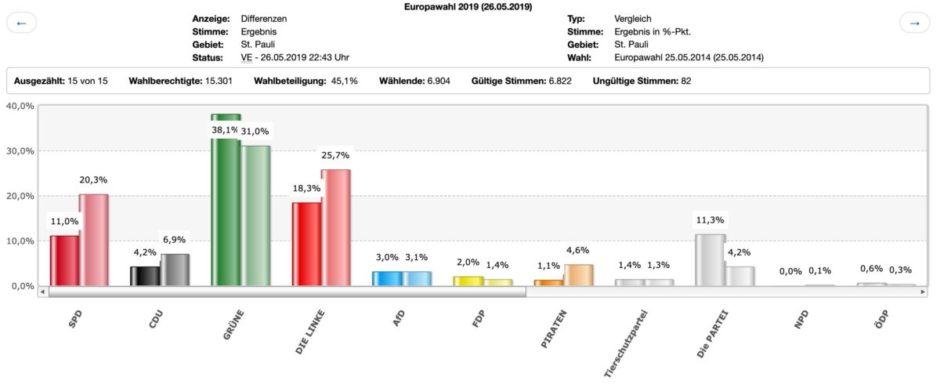 Auf St. Pauli fassen Rechte keinen Fußbreit, das ist die frohe Kunde dieser Euopawahl. Die SPD, die mit Andy Grote ein FCSP-Mitglied – ein umstrittenes – und einen „Mitte-Mann“ zum Innensenator hat, kommt unter die Räder und lässt die Satire-Partei, Die Partei (in Hamburg gegründet) an sich vorbei ziehen.