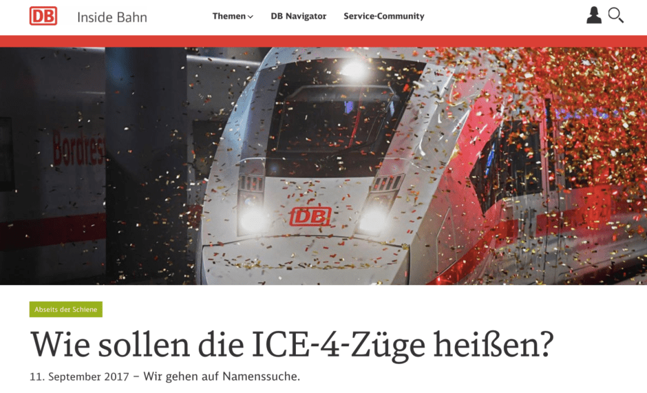 Hintergrund ist eine Online-Umfrage auf Bahn.de, wie denn die neuen ICE getauft werden sollen. Nachdem ICEs bisher nach Städten benannt wurden, sind dieses Mal Personen als Taufpaten vorgesehen.