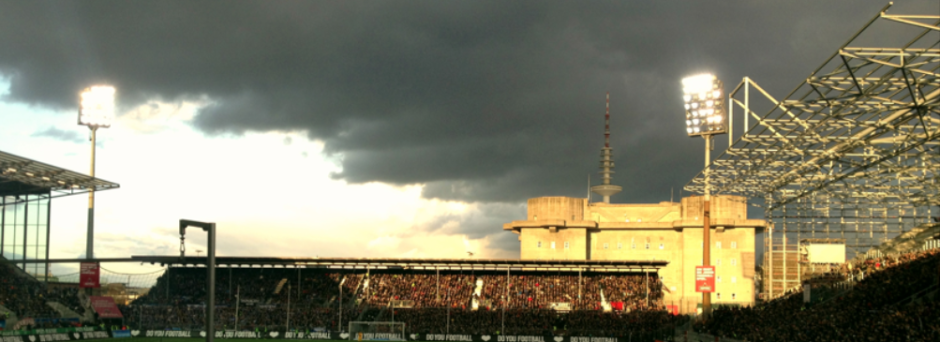 Als ich ans Millerntor radle, liegen schwere Gewitterwolken über Hamburg. Die Luft ist zum Schneiden dick, aber es regnet noch nicht. Seit dem Abstieg des HSV hat es nicht mehr geregnet in Hamburg, so sagt ein Facebook Meme; heute soll es aber soweit sein.