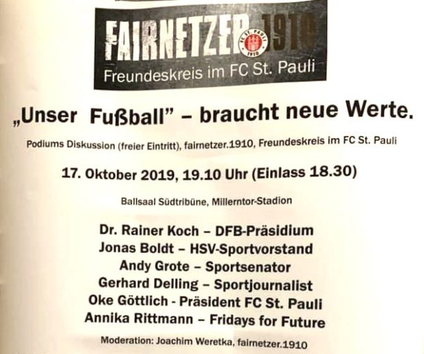 „Neben anderen Podiums-Teilnehmerinnen und Teilnehmern sind Hamburgs Innensenator Andy Grote und DFB-Vizepräsident Rainer Koch geladen. Wir halten die Teilnahme dieser beiden Personen bei einer Diskussion über „Werte“ in unserem Stadion für völlig deplatziert und nicht akzeptabel“